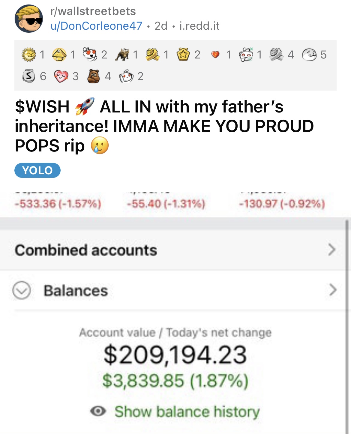 这个叫DonCorleone47的小伙伴声称把父亲的20万美金的遗产all in进了 $ContextLogic Inc.(WISH)$ ,截至目前为止,该笔遗产已经有了3839.85美元的浮盈,希望他的父亲在天之灵为他感到骄傲,在天堂保佑WISH一飞冲天!