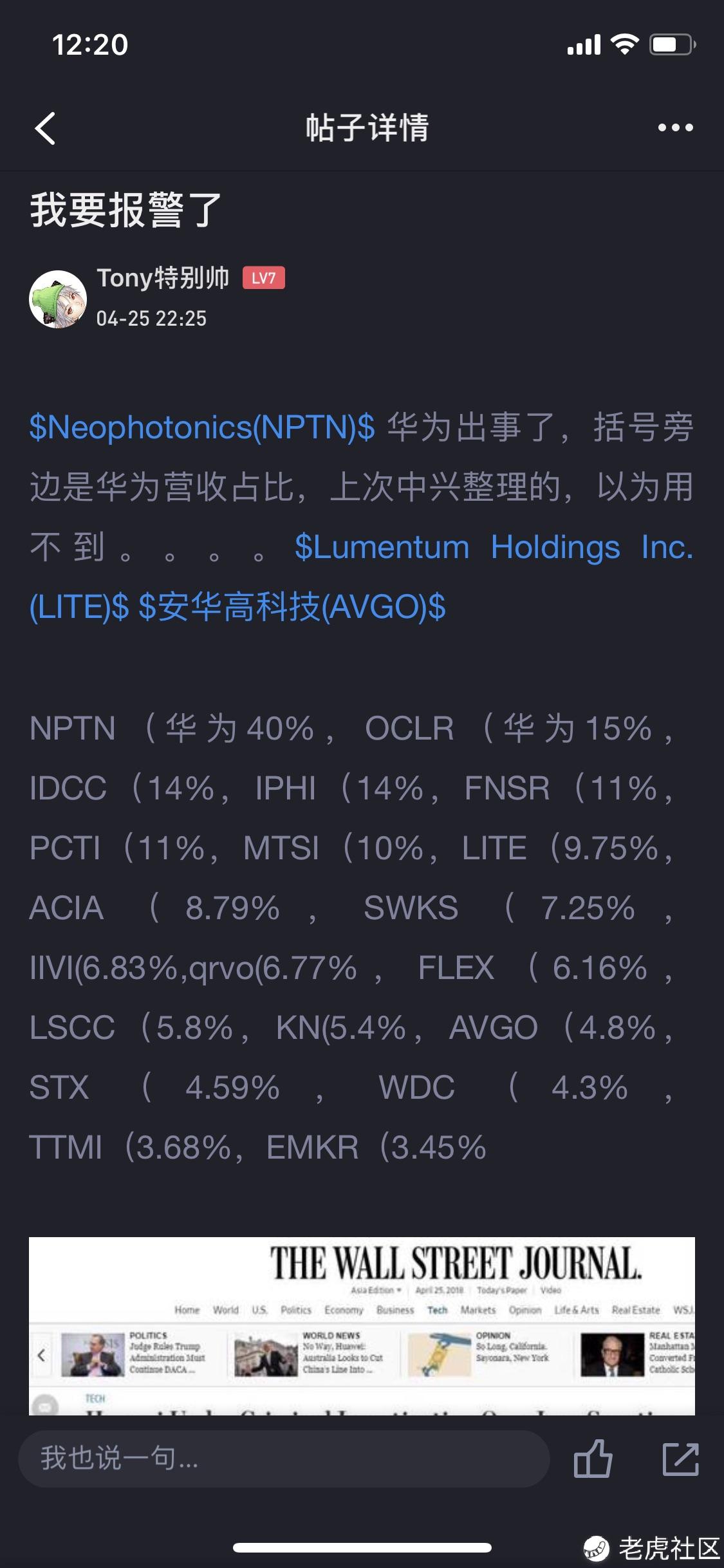 $Neophotonics(NPTN)$ 华为出事了,括号旁边是华为营收占比,上次中兴整理的,以为用不到。。。。$Lumentum Holdings Inc.(LITE)$ $安华高科技(AVGO)$