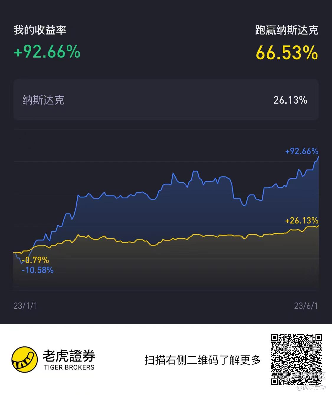 因为重仓股特斯拉大涨,今年以来我的账户收益率为92%,上周是74%,跑赢纳指的26%。