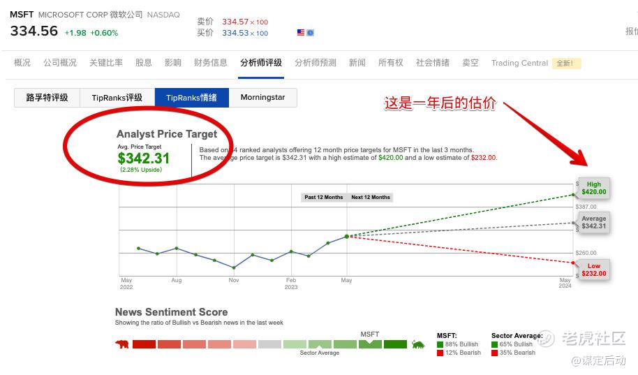 分析师们给出微软12个月后的平均估价在342,而现在微软的股价到了333,就是说已经Price In了2024年的盈利预期了,因此毫无疑问的,现在的股价属于高估区间,这个阶段我肯定是不会去追高的。