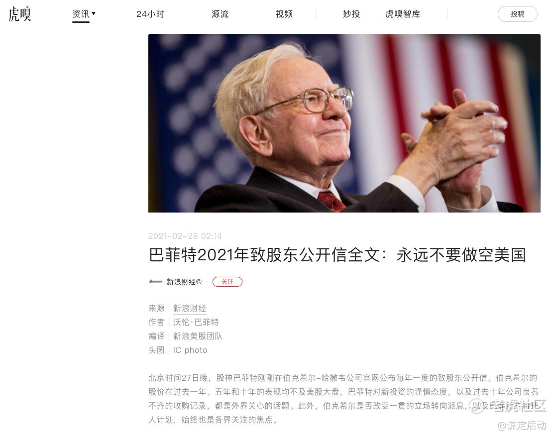 在2021年,正值美股经历了疫情以及史诗级股市熔断之后,整个市场还处于惊魂未定的状态。正是在那个时刻,巴菲特在致股东的公开信中发表了一番引人注目的观点:永远不要做空美国。