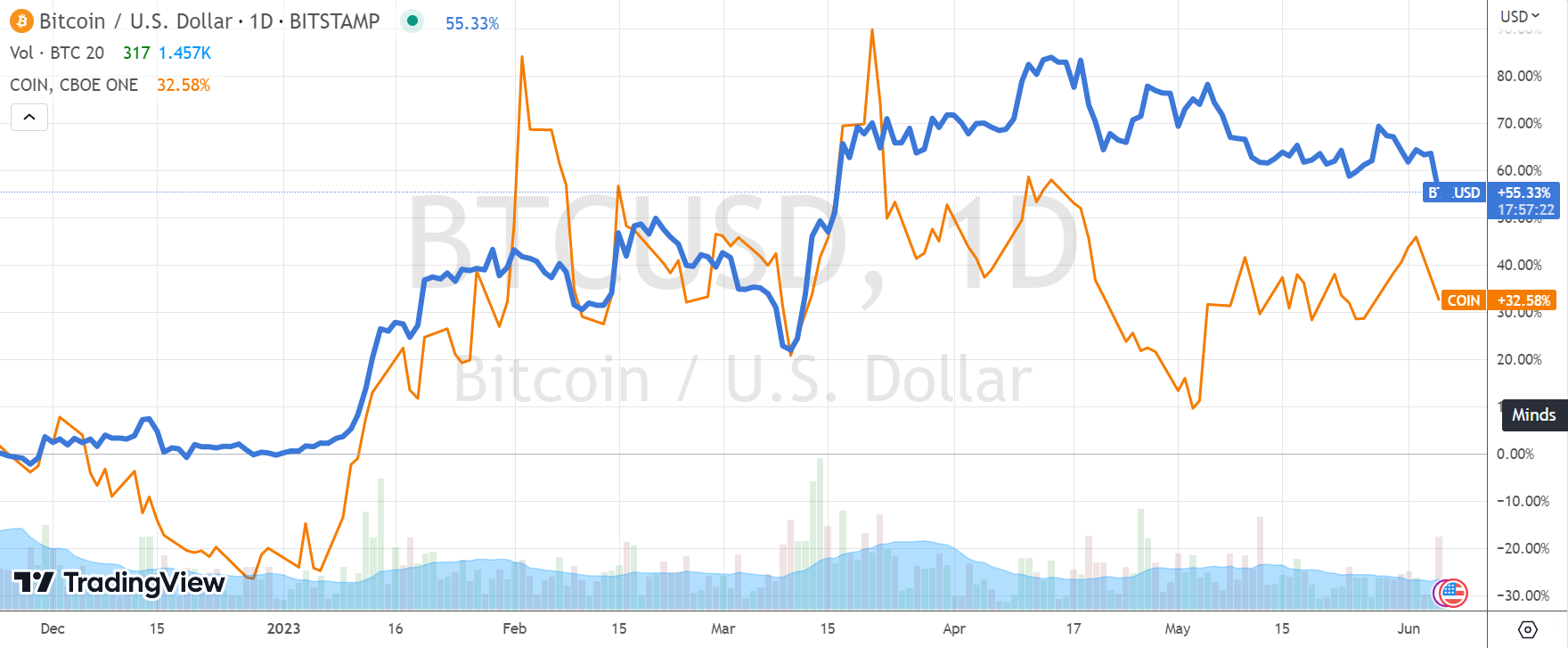 美国SEC起诉全球最大的加密货币交易所币安违反美国证券法规后, $Coinbase Global, Inc.(COIN)$ 股价下跌了9.1%, $MicroStrategy Incorporated(MSTR)$ 股价下跌了8.5%,比特币(BTC-USD)在周一交易中失去了5.8%。