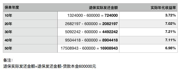 50年后退保,可以获得17508943元,扣除贷款本金60万,实际约获得1690万(实际支出:本金为40万+50年利息60万=100万),50年,约16.9倍。