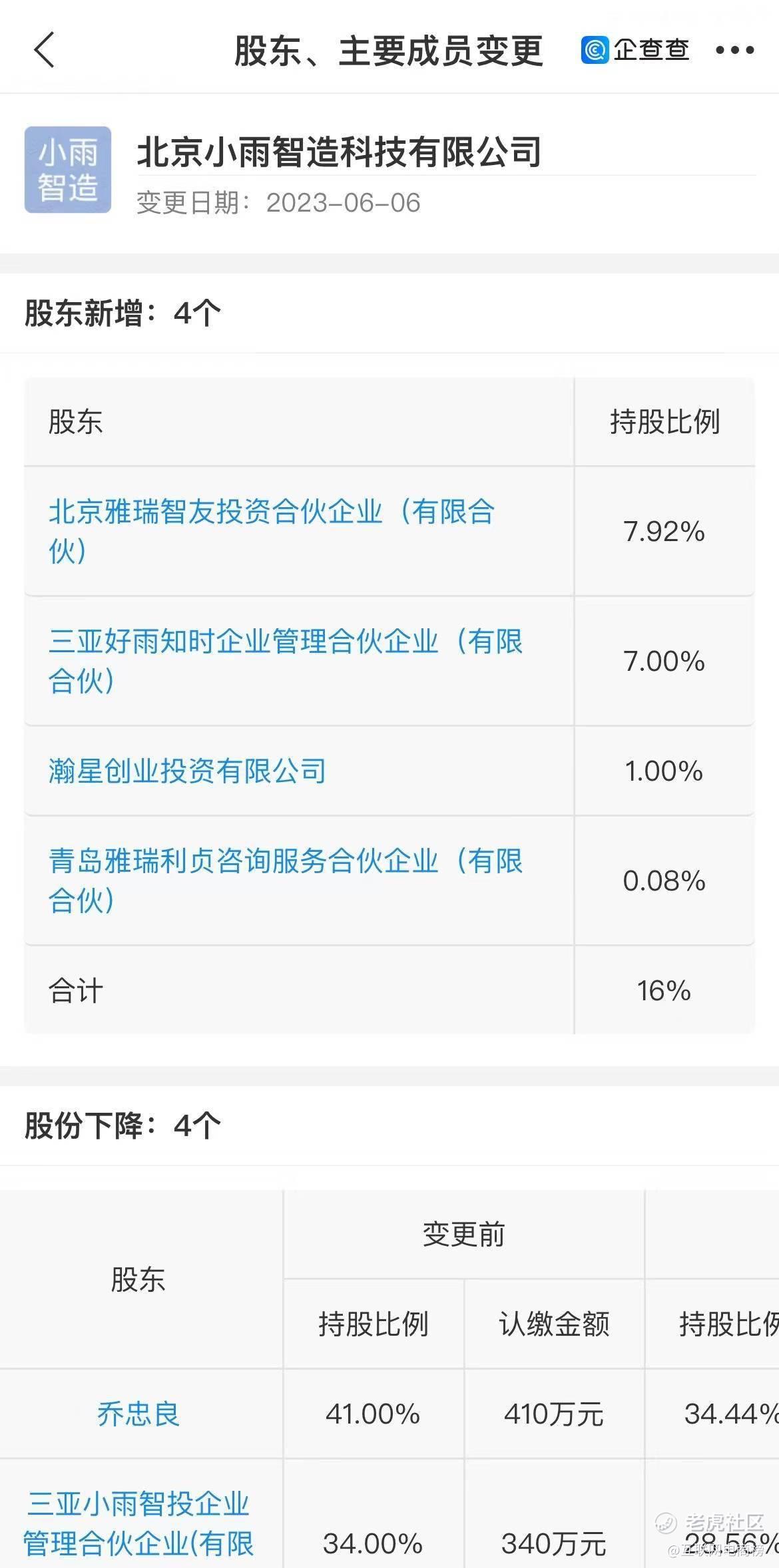 据企查查,北京小雨智造科技有限公司(以下简称“小雨智造”)发生工商变更,新增瀚星创业投资有限公司(以下简称“瀚星创业投资”)等股东,同时公司注册资本由1000万元人民币增至约1190万元人民币,增幅超19%。