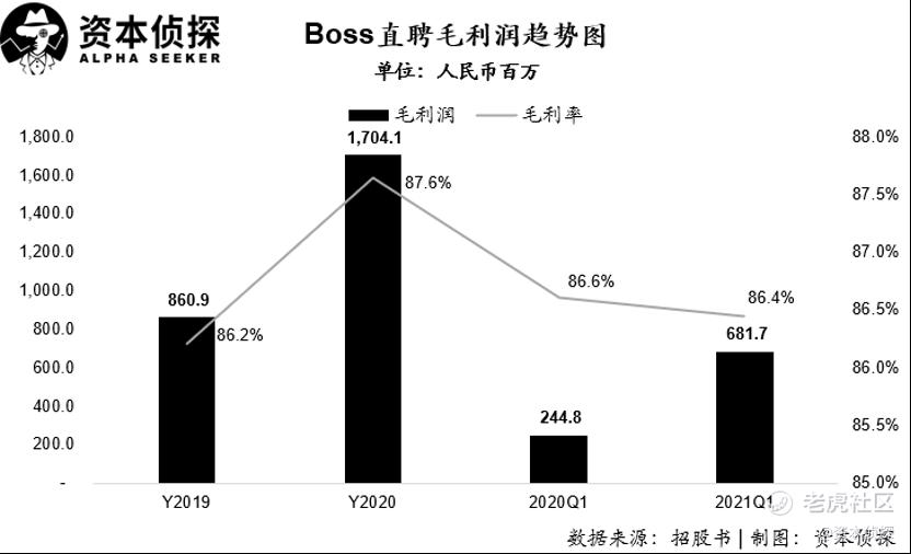 BOSS直聘2019年、2020年及2021年一季度毛利润分别为8.61亿17.04亿以及6.82亿元人民币,报告期内毛利率均超过85%以上。即使是互联网领域中公认的能赚钱的游戏以及广告等的毛利水平,也很难望其项背。