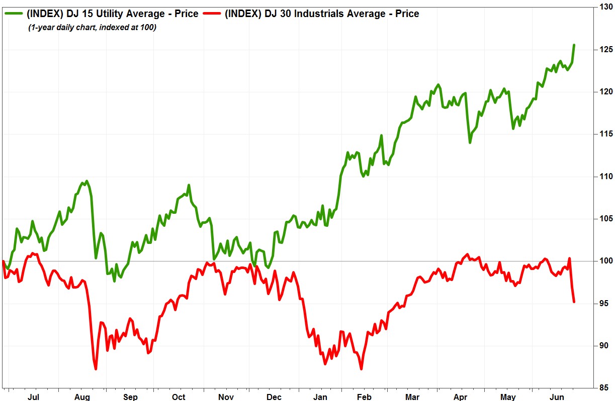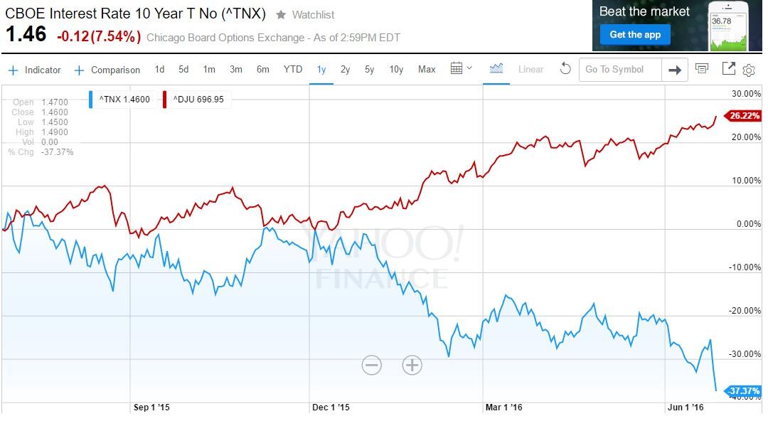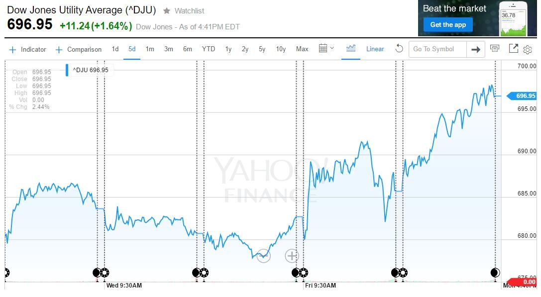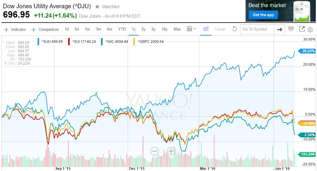 #英国退欧# #熊市来了吗#带来的恐慌不断蔓延,原本胸有成竹的风险资金火速撤回。这两天,欧美股市跳崖式下跌。标普500指数跌破2000点。但是有一个指数例外——道琼斯公共事业平均指数(DJU),它在周一普跌的情况下,逆势大涨1.64%创下了历史新高。