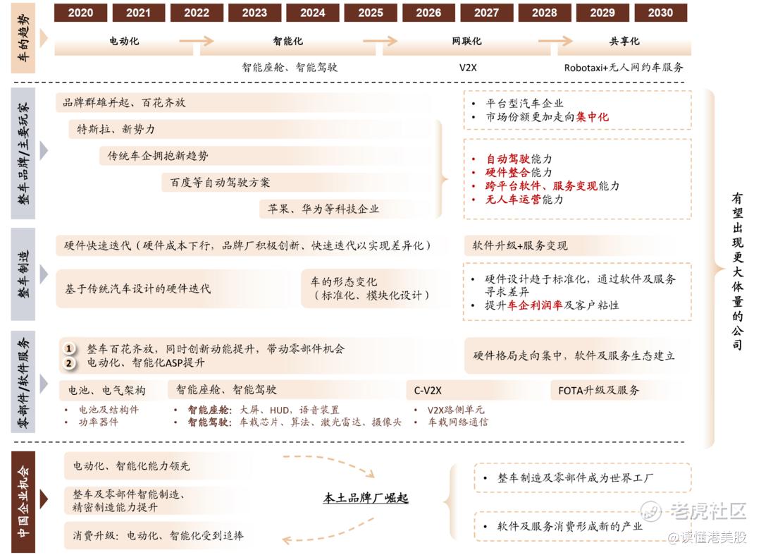 势。整车品牌、整车制造、零部件、软件服务等有望孕育平台型汽车企业,市场份额更加走向集中化。本土品牌厂商有望崛起,通过软件及服务体现差异性,并从硬件向软件及服务转型,带来车企利润率及客户粘性的提升。