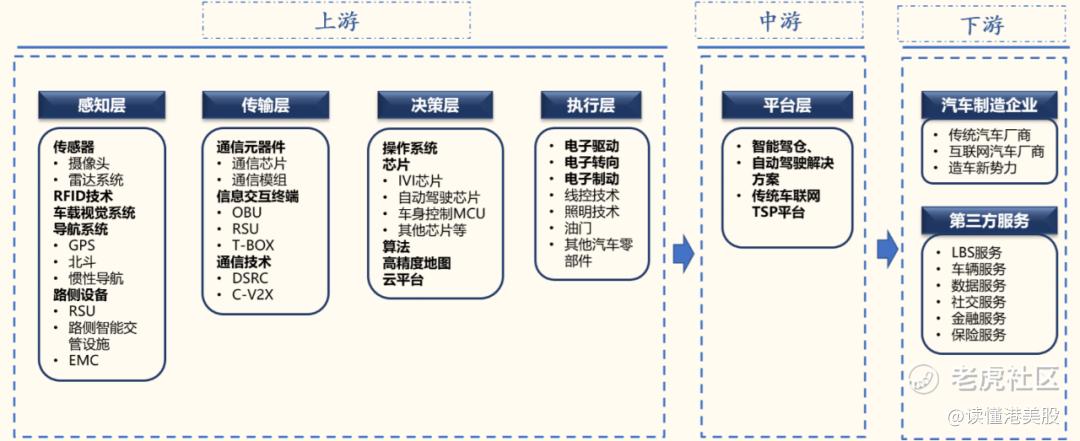 中游:平台层,包括整合的智能驾舱平台、自动驾驶解决方案以及传统的车联网TSP平台。