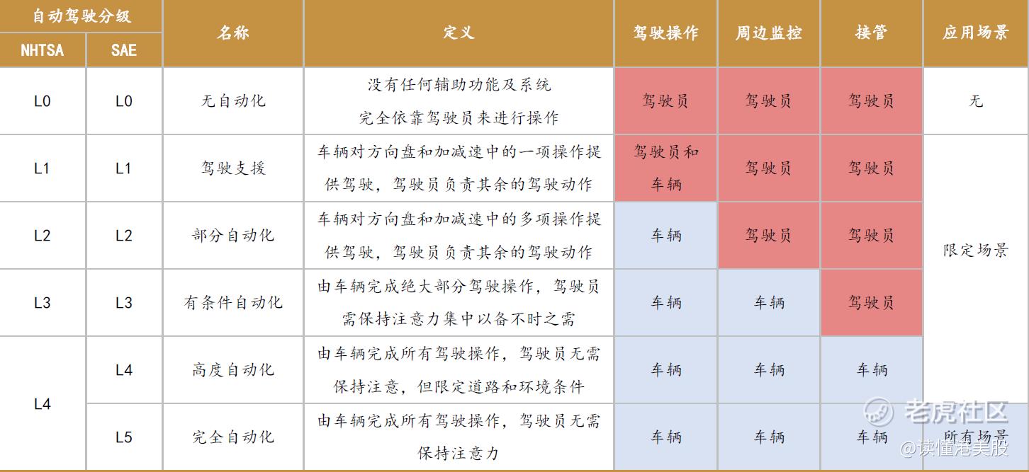 自动驾驶技术分为多个等级,目前国内外产业界采用较多的为美国汽车工程师协会(SAE)和美国高速公路安全管理局(NHTSA)推出的分类标准。该标准将自动驾驶的概念分为L0-L5,其中L1-L3主要起到辅助驾驶功能。当达到L4级别时,车辆控制权可完全交给系统。