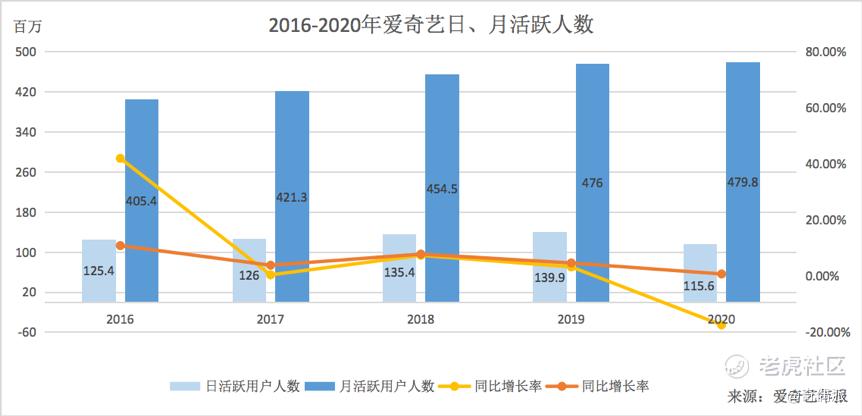 相反,爱奇艺在2020年面临了付费用户数量首次下降的尴尬局面,比2019年少了520万名用户,日活跃人数也从1.4亿人降到了1.2亿人,比2019年少了2430万用户。