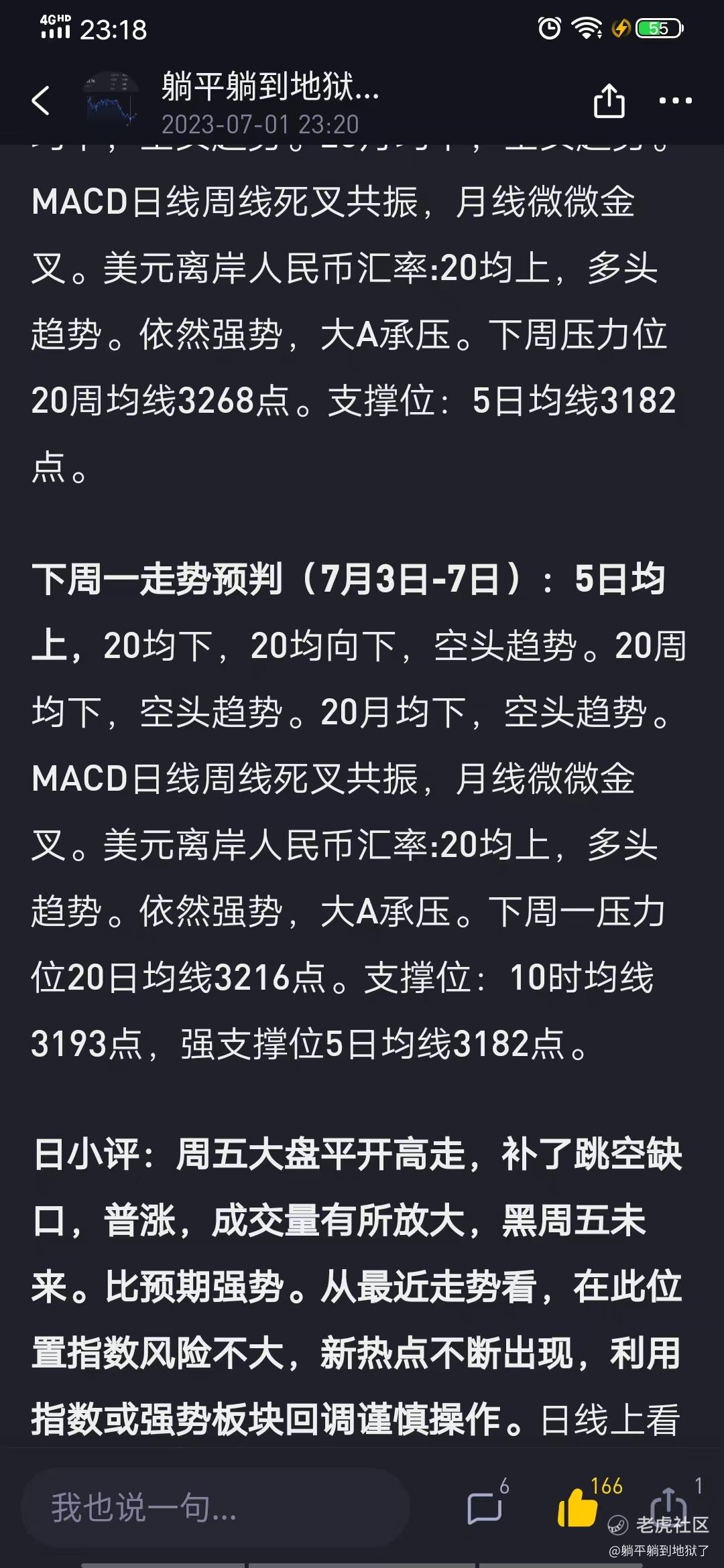 2、下周走势预判(7月3日-7日):5日均上,20均下,20均向下,空头趋势。20周均下,空头趋势。20月均下,空头趋势。MACD日线周线死叉共振,月线微微金叉。美元离岸人民币汇率:20均上,多头趋势。依然强势,大A承压。下周压力位20周均线3268点。支撑位:5日均线3182点。