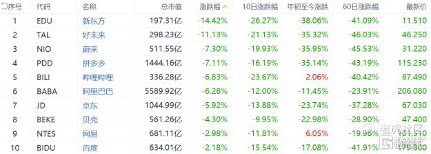 区块链以及在线教育行业跌幅在所有中概股中居前。区块链公司中:第九城市跌近18.5%,亿邦国际跌超16.5%,嘉楠科技跌超11.5%。