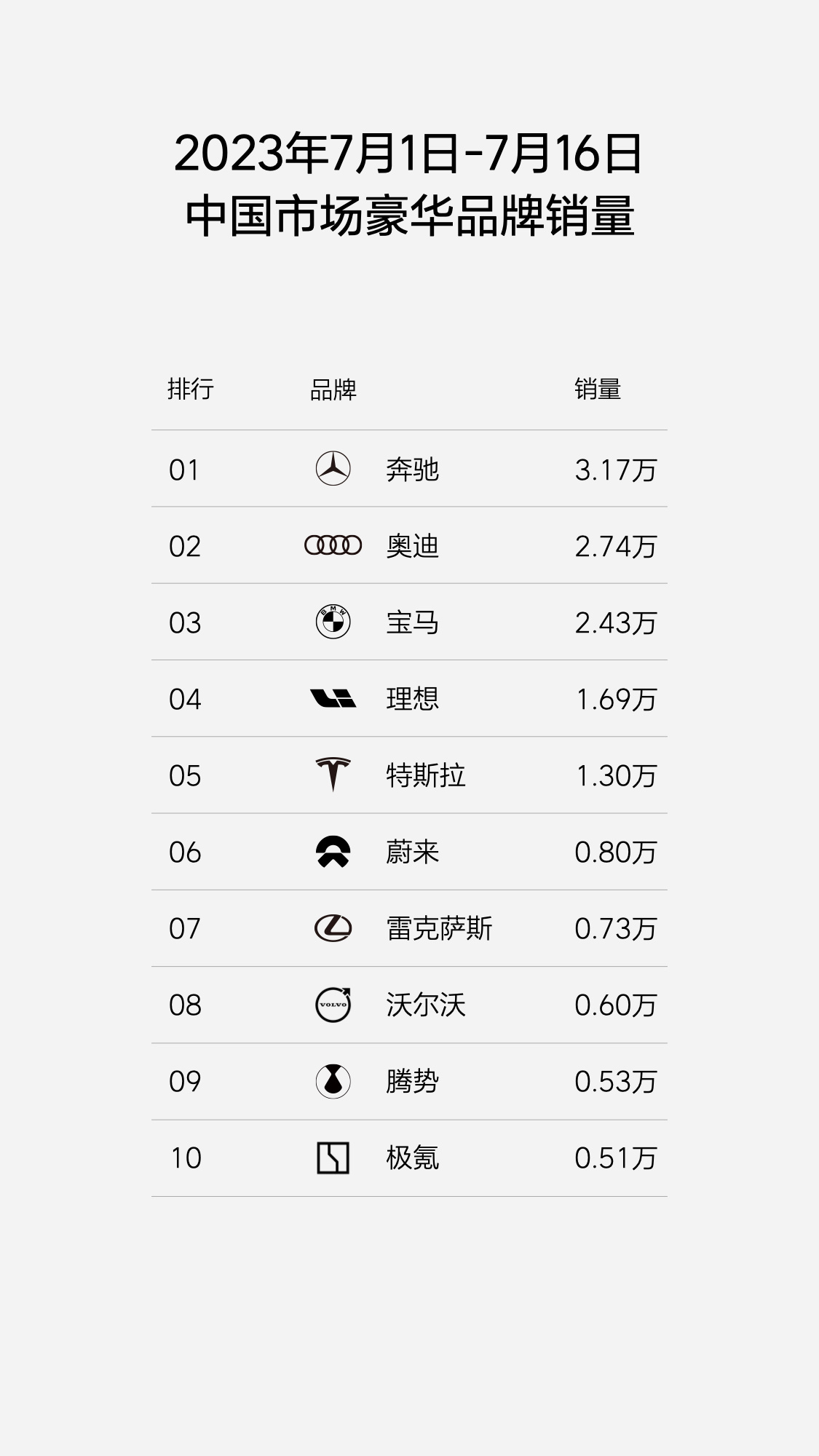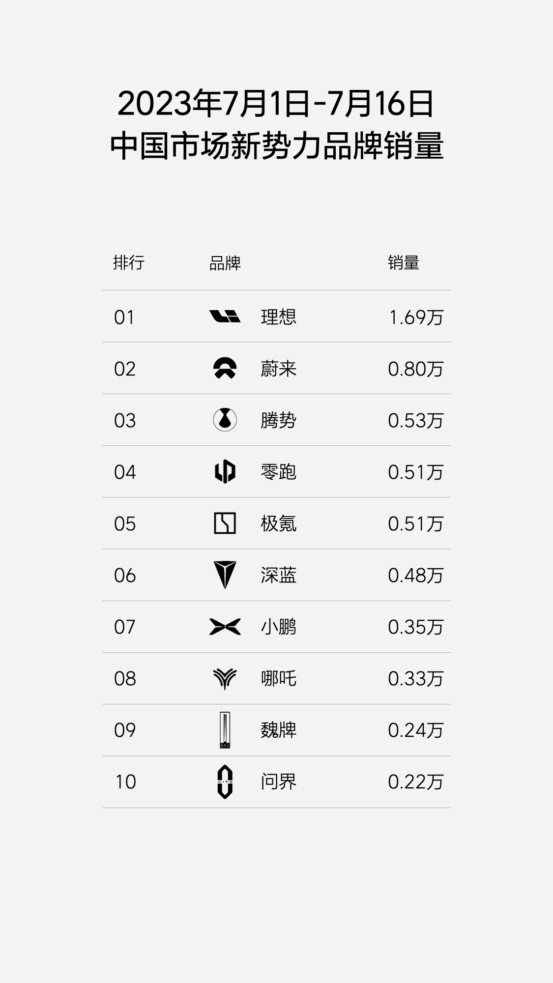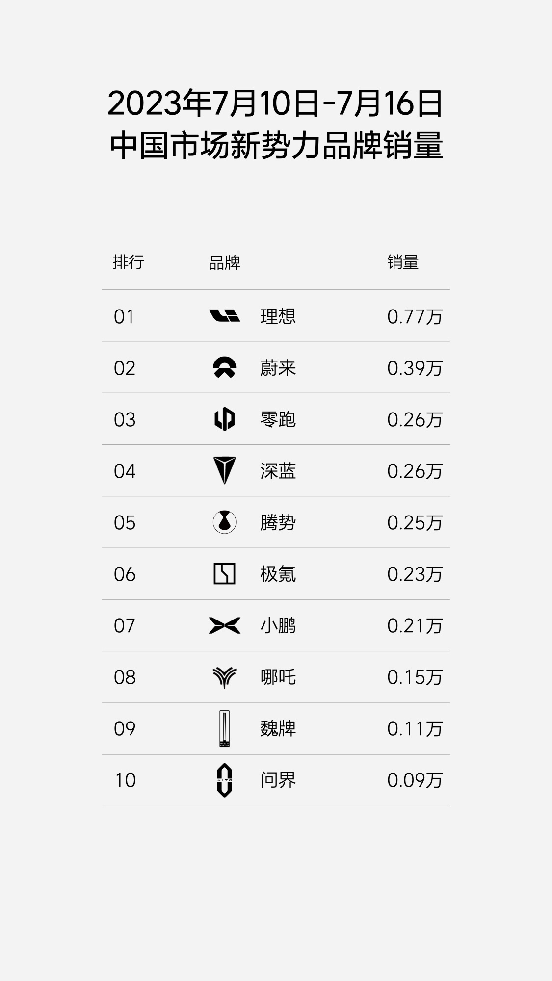 【行业动态】2023年第29周新势力车企销量(7.10-7.16)