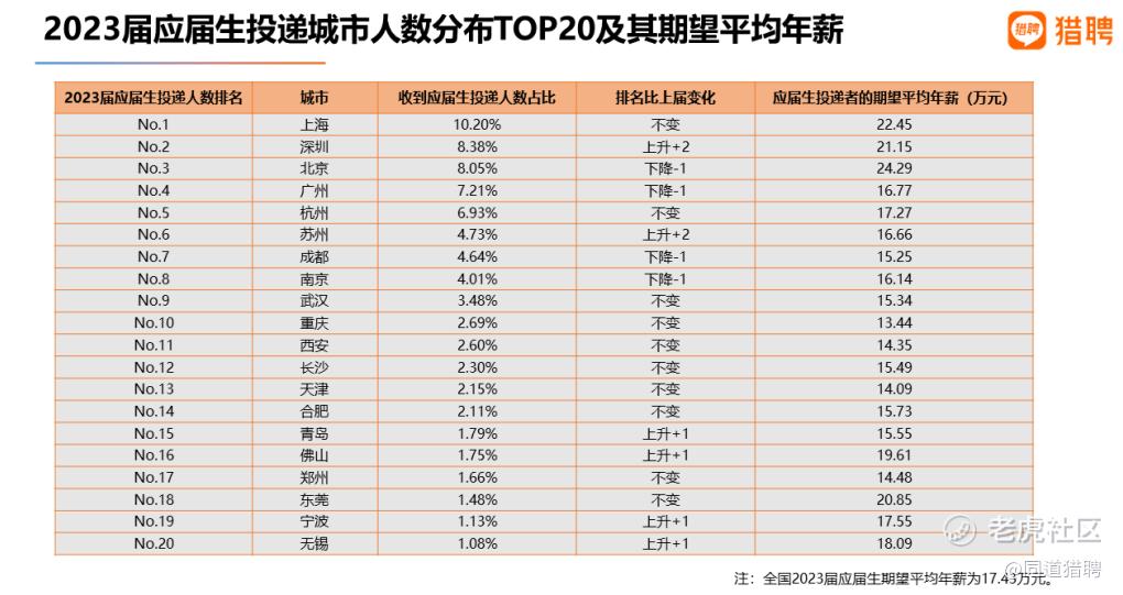 从投递这 20 个城市的应届生期望平均年薪来看,北京、上海、深圳、东莞最高,为 24.29万、22.45 万、21.15 万、20.85 万,均高出应届生整体期望平均年薪(17.43 万)。