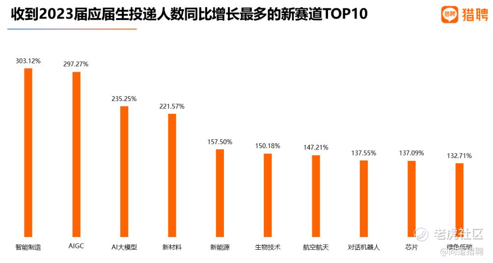 新赛道的蓬勃发展对应届生产生了强大的吸引力。在 2023 届应届生投递人数增长最多的TOP10 赛道中,智能制造、AIGC、AI 大模型排名前三,同比增长 303.12%、297.27%、235.25%。