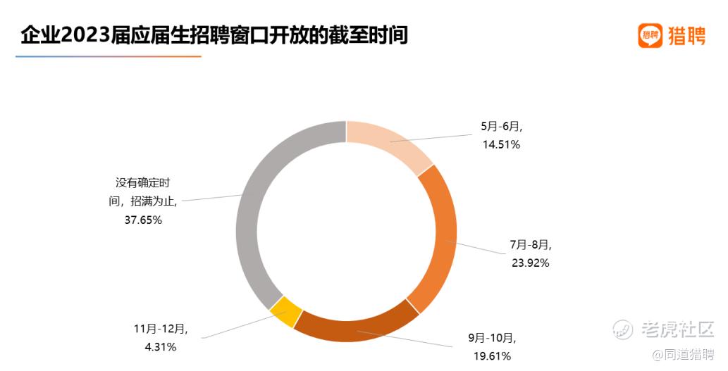 本届校招窗口期持续多久?37.65%的企业“没有确定时间,招满为止”;23.92%的企业最晚到 7-8 月;14.51%的企业为 5-6 月;19.61%的企业为 9-10 月。猎聘职场顾问建议还未找到工作的应届生抓紧窗口期,尽早落实工作,安顿身心。