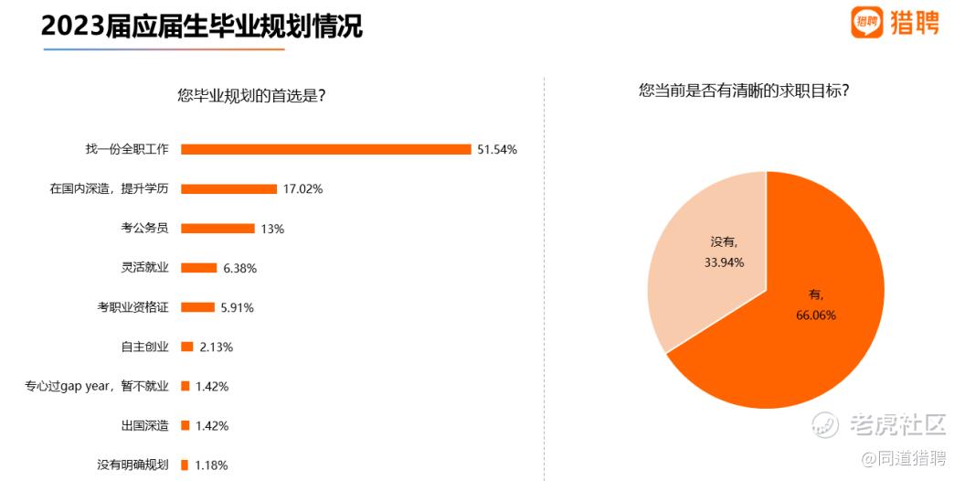 猎聘针对 2023 届应届生的调研显示, 51.54%的人在毕业规划中首选找全职工作,17.02%首选“国内深造,提升学历”,这两项位居前二。“考公务员”“灵活就业”排名第三、第四,占比 13%、6.38%。在首选求职的应届生中,33.94%的人“没有清晰的求职目标”。