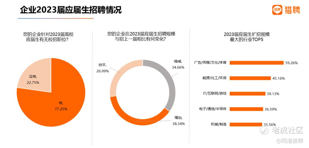 猎聘针对企业 HR 的调研显示,77.25%的企业有面向 2023 届应届生的职位。其中,增加校招规模的企业占 38.34%;扩招最多的前二行业是广告/传媒/文化/教育、能源/化工/环保,分别有 59.26%、45.16%的企业扩大校招规模。