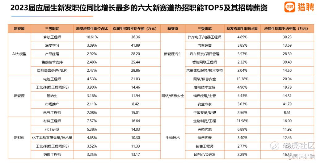 比较应届生职位增长最快的六大新赛道(AI 大模型、新能源、新材料、新能源汽车、网络/信息安全、生物技术)中新发职位最多的三级职能 TOP5 发现,每个新赛道热招职能的应届生招聘平均年薪差别较大,从十万左右到二十几万、三四十万不等。