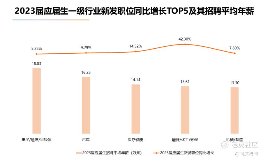 在全世界都提倡低碳环保、致力实现碳中和碳达峰的趋势下,能源/化工/环保的重要性日益显现。在这 TOP5 行业中,应届生招聘平均年薪最高的是电子/通信/半导体,为 18.83 万,也领先所有一级行业。