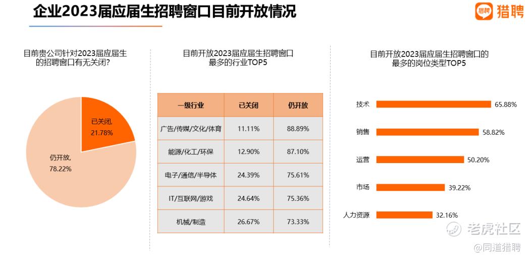 2、目前有近 8 成企业开放校招窗口,广告/传媒/文化/教育机会最多,技术岗招聘力度最大