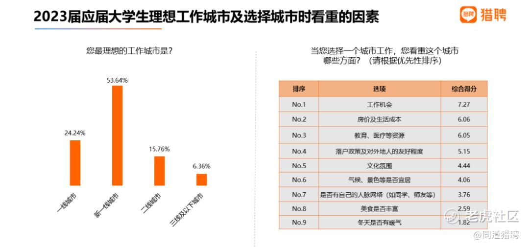 猎聘针对 2023 届应届生的调研显示,53.64%的应届生表示最理想工作城市是新一线城市,其次是一线城市(占比 24.24%)。