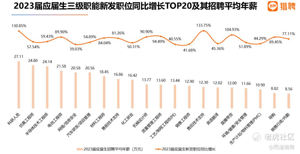 在 2023 届应届生新发职位同比增长最多的三级职能 TOP20 中,售后技术支持、科研人员、带货直播位居前三,增长率为 133.75%、130.85%、104.93%。