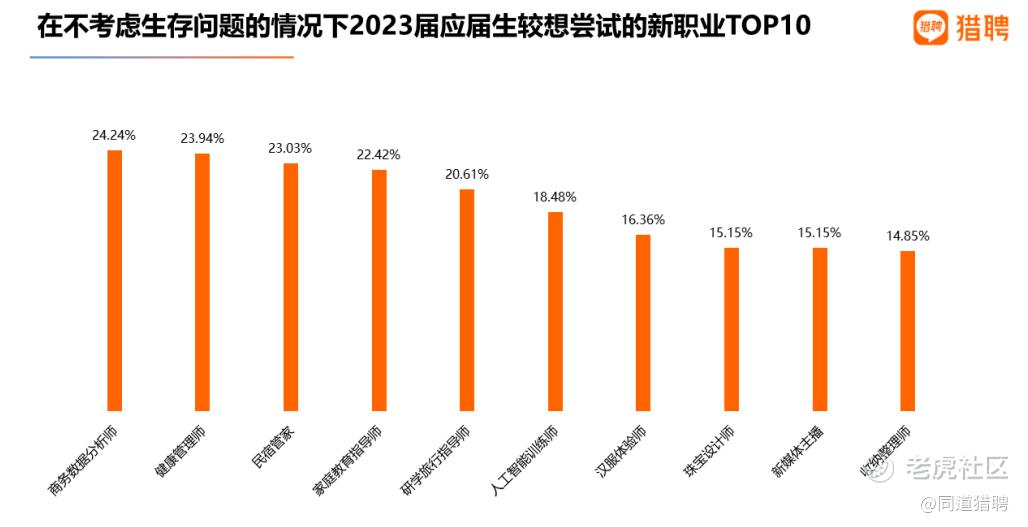 当问及应届生在不考虑生存问题的情况下较想尝试哪些新职业?答复中位居前五的是商务数据分析师、健康管理师、民宿管家、家庭教育指导师、研学旅行指导师,得票率均超 20%。