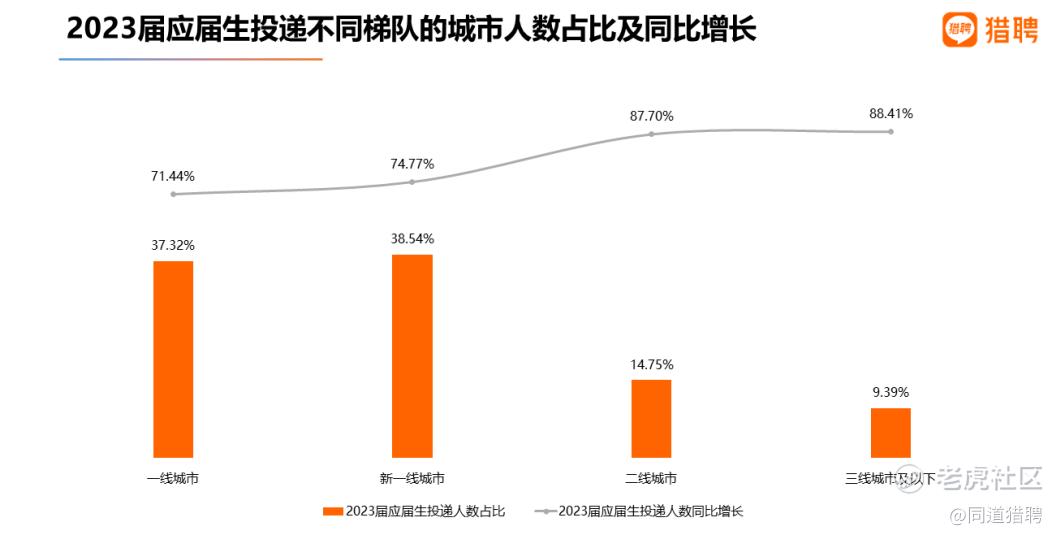从 2023 届应届生投递不同梯队的城市来看,新一线城市占比最高,为 38.54%;其次是一线城市(37.32%)。投递各梯队城市的应届生人数较上届同比增长均超 70%,排序为:三线城市及以下(88.41%)>二线城市(87.70%)>新一线城市(74.77%)>一线城市(71.44%)。