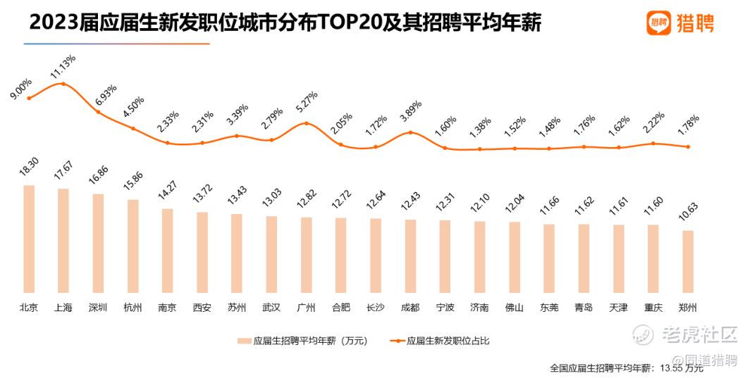 从 2023 届应届生新发职位城市分布 TOP20 来看,上海、北京、深圳、广州位居前四,占比为 11.13%、9.00%、6.93%、5.27%。
