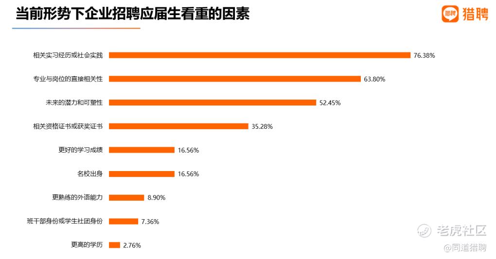 猎聘调研显示,企业招聘应届生最看重三大要素:相关实习经历或社会实践、专业与岗位的直接相关性、未来的潜力和可塑性,得票率为 76.38%、63.8%、52.45%。相关资格证书或获奖证书位居第四(得票率 35.28%);名校出身、更好的学习成绩并列第五,得票率均为 16.56%。