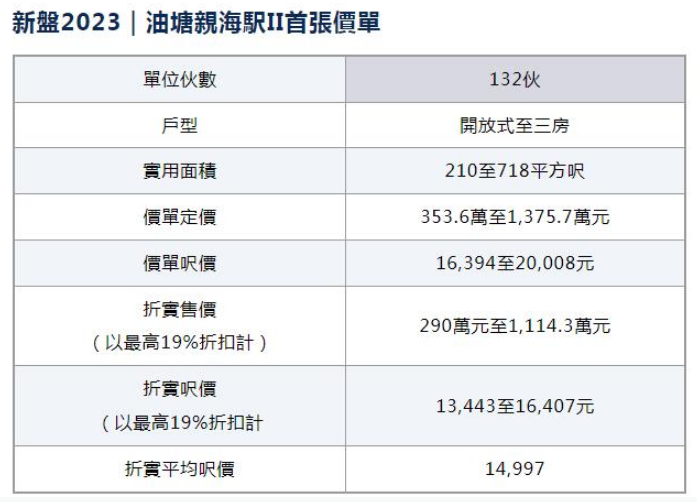 8月3日,长实集团发布了“亲海駅II”项目的首张价格单,共涉及132套住房,每平方英尺(10.76平方英尺相当于1平方价)价格为港币1.5万元。
