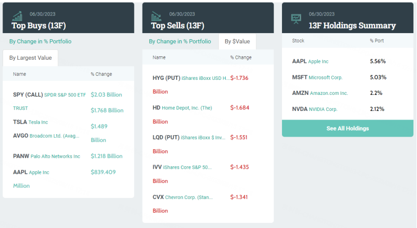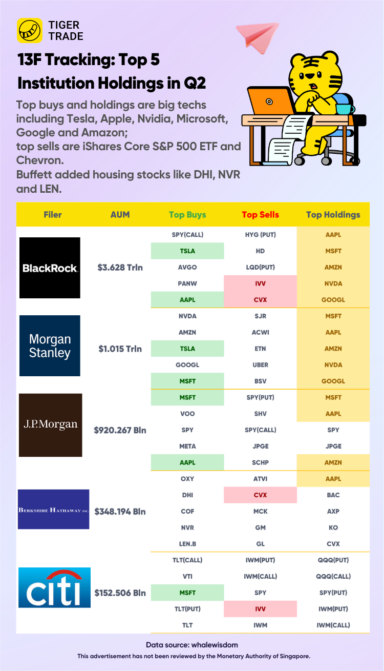 华尔街顶级投行和对冲基金都已陆续披露二季度13F报告,持仓情况浮出水面!从13F报告来看,美股科技股仍是重要加仓标的,包括 $特斯拉(TSLA)$ 、$苹果(AAPL)$、$英伟达公司(NVDA)$、$微软(MSFT)$、$谷歌母公司(Alphabet)(GOOG)$以及$亚马逊(AMZN)$;而卖出方面,主要涉及$iShares标普500指数ETF(IVV)$和$雪佛龙(CVX)$。