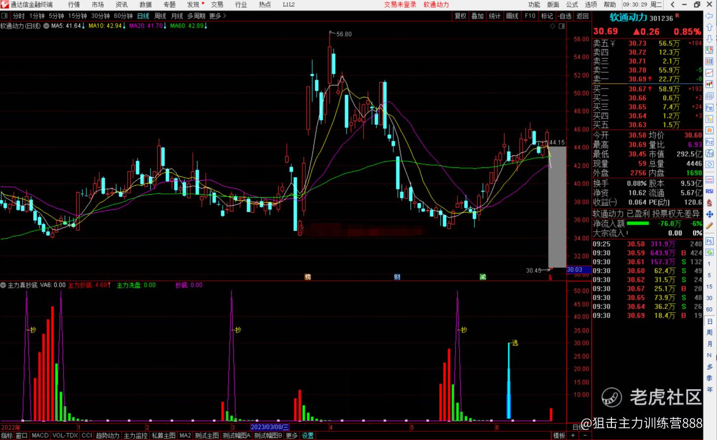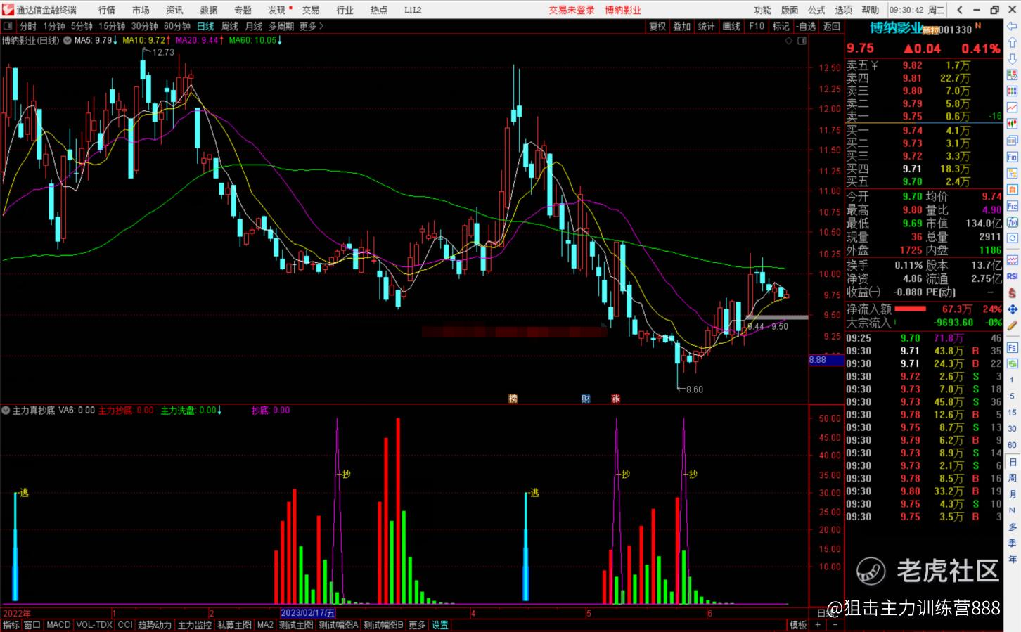 VA1:=REF((LOW+OPEN+CLOSE+HIGH)/4,1); VA2:=SMA(ABS(LOW-VA1),13,1)/SMA(MAX(LOW-VA1,0),10,1); VA3:=EMA(VA2,10); VA4:=LLV(LOW,33); VA5:=EMA(IF(LOW<=VA4,VA3,0),3); VA6:0; 主力抄底:IF(VA5>REF(VA5,1),VA5,0),COLORRED,NODRAW; STICKLINE(VA5>REF(VA5,1),0,VA5,1,0 ),COLORRED; 主力洗盘:IF(VA5<REF(VA5,1),VA5,0),COLORGREEN,NODRAW; STICKLINE(VA5<REF(VA5,1),0,VA5,1,0),COLORGREEN; VAA1:=100-3*SMA((CLOSE-LLV(LOW,65))/(HHV(HIGH,80)-LLV(LOW,65))*100,20,1)+2*SMA(SMA((CLOSE-LLV(LOW,65))/(HHV(HIGH,80)-LLV(LOW,65))*100,20,1),15,1); VAA2:=100-3*SMA((OPEN-LLV(LOW,65))/(HHV(HIGH,80)-LLV(LOW,65))*100,20,1)+2*SMA(SMA((OPEN-LLV(LOW,65))/(HHV(HIGH,80)-LLV(LOW,65))*100,20,1),15,1); VAA3:=VAA1<REF(VAA2,1) AND VOL>REF(VOL,1) AND CLOSE>REF(CLOSE,1); A:=WINNER(CLOSE+CLOSE*15/100)*100; B:=WINNER(CLOSE+CLOSE*0/100)*100; 逃顶:=CROSS(82,RSI); STICKLINE( 逃顶,逃顶,10,3.5,0),COLORFF5500; STICKLINE( 逃顶,逃顶,15,2.5,0),COLORFF8800; STICKLINE( 逃顶,逃顶,20,1.5,0),COLORFFAA00; STICKLINE( 逃顶,逃顶,25,0.5,0),COLORFFCC00; STICKLINE( 逃顶,逃顶,30,0.1,0),COLORFFFF00; D1:=(C+L+H)/3; D2:=EMA(D1,6); D3:=EMA(D2,5); BBUY:=CROSS(D2,D3); VARR1:=SMA(MAX(CLOSE-REF(C,1),0),6,1)/SMA(ABS(CLOSE-REF(C,1)),6,1)*100; DRAWTEXT(CROSS(82,VARR1),30,'--逃'),COLORYELLOW; 趋势线:=3*SMA((CLOSE-LLV(LOW,27))/(HHV(HIGH,27)-LLV(LOW,27))*100,5,1)-2*SMA(SMA((CLOSE-LLV(LOW,27))/(HHV(HIGH,27)-LLV(LOW,27))*100,5,1),3,1); 抄底:IF(CROSS(趋势线,6),50,0),COLORMAGENTA,LINETHICK1; DRAWTEXT(FILTER(抄底,10)=1,35,'--抄'),COLORYELLOW,LINETHICK1;
