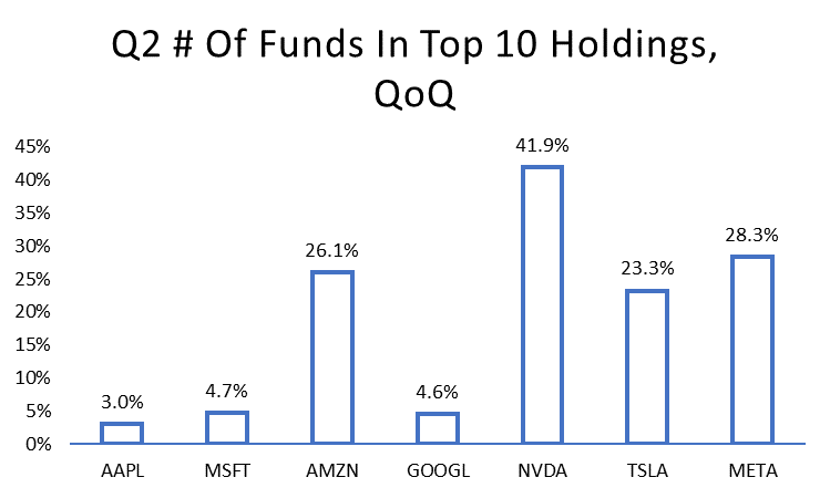 对冲基金的持股数量方面,TSLA和GOOG环比下降6%不等,而NVDA、AAPL和META增持量排名前三。