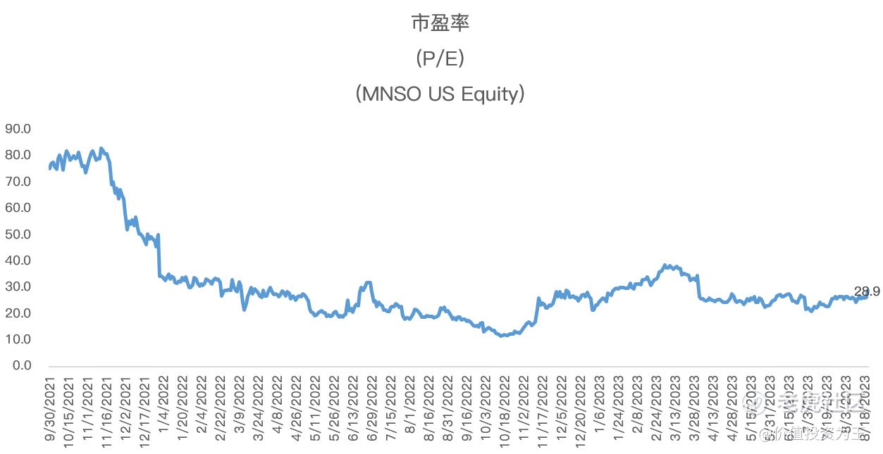 从估值上看,名创优品目前的市盈率为29倍,或仍有上升空间: