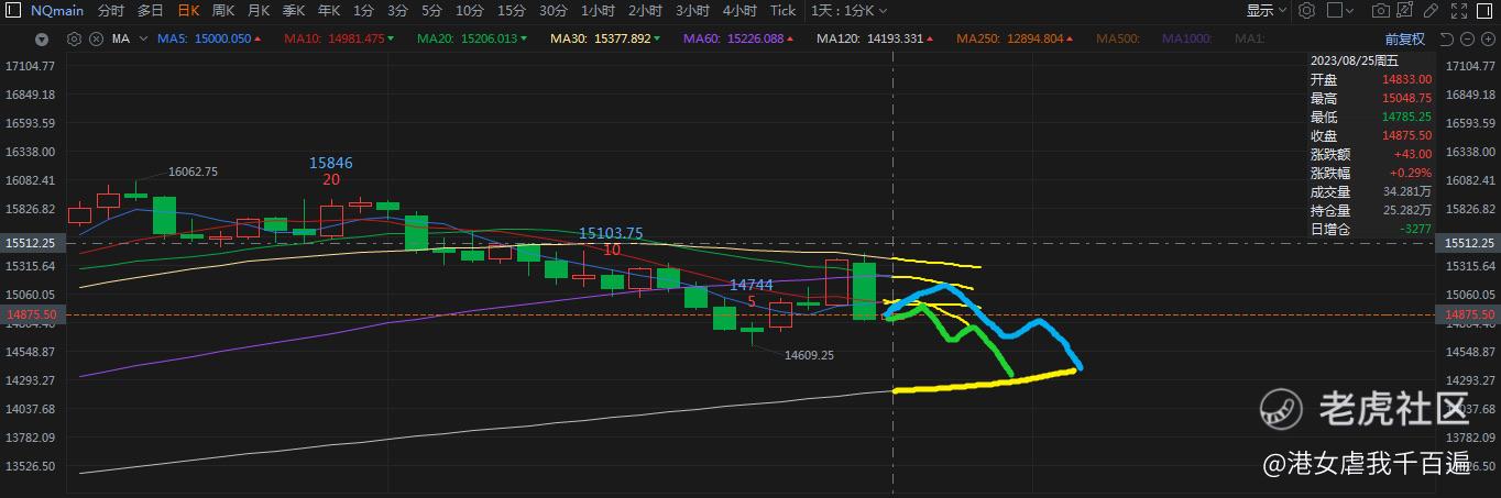纳指晚上的大阴线改变了其良好的反弹势头,要观察今晚和周一的走势,反弹力度弱或者无法回到15000上方,则会重新找14600/14300支撑(留意蓝线和绿线的两种跌法)。不过个人对纳指的反弹还是有信心的,总能给人惊喜。