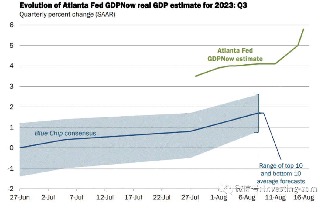 亚特兰大联储的GDP Now数据显示,第三季度(7-9月)的GDP增速预计高达5.8%,因消费持续强劲,以及工业产出和新屋开工数超预期反弹。