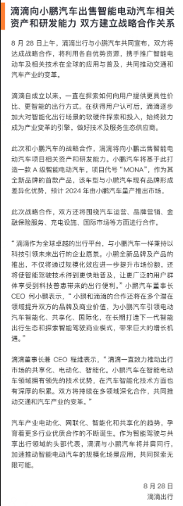 双赢合作:小鹏拟58.35亿港元收购滴滴智能汽车