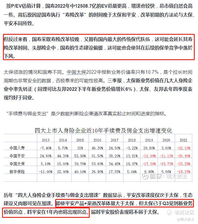教主在平安2022年报中长文中曾表示,中国人寿因改革启动时间、生态建设偏缓,后续将不会一直领涨;平安将继太保之后出现新业务价值拐点,目前两点均已兑现。