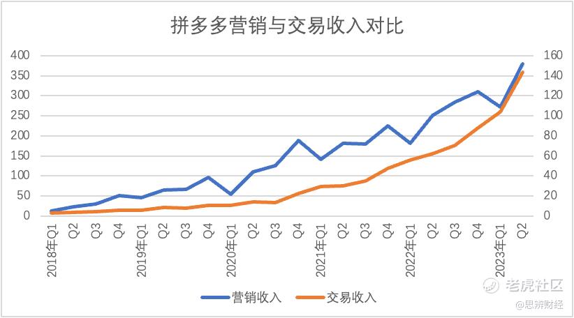 2023年Q2拼多多总营收达到522.8亿元,同比增长66%,其中营销收入同比增长50%,达到379.3亿元,交易收入同比增长131%,达到143.5亿元。