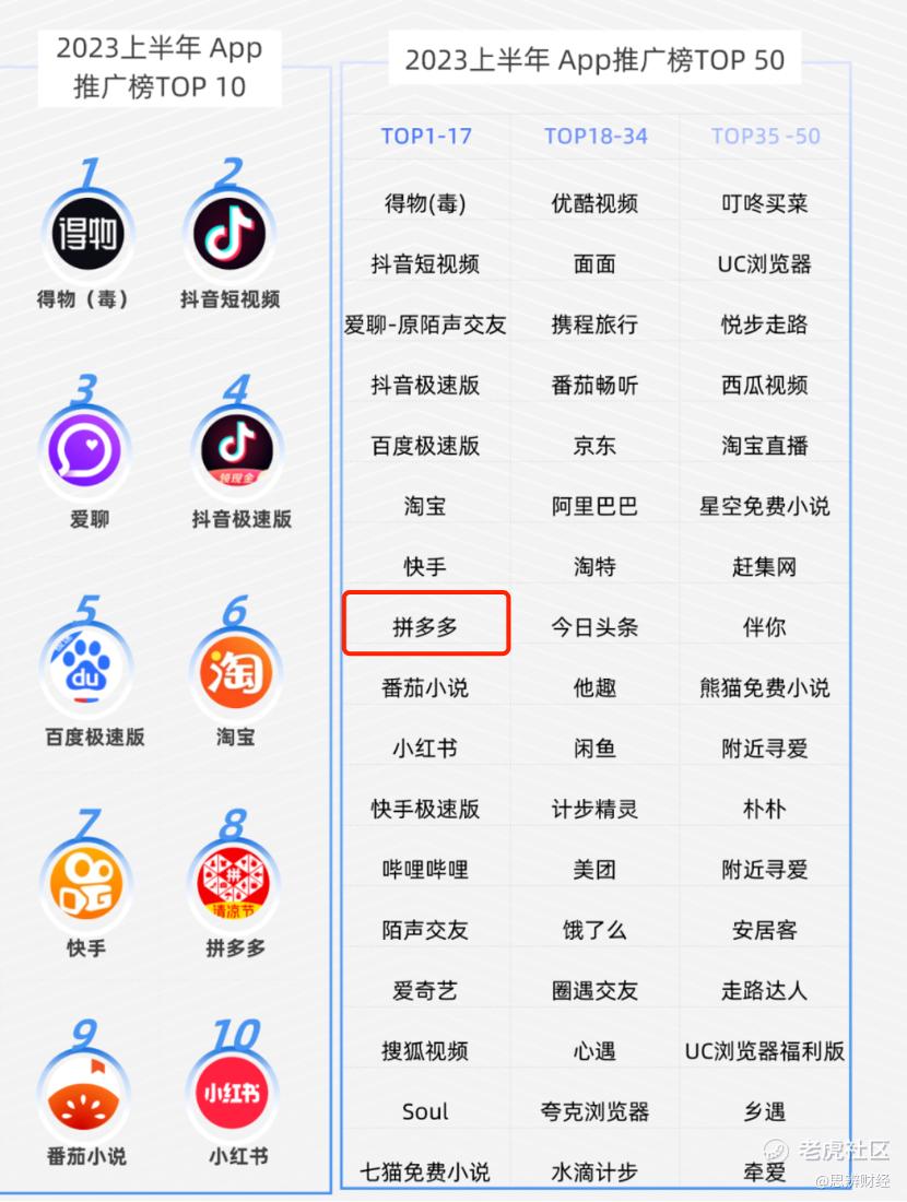 上图为AppGrowing制作的2023上半年App推广排行榜,拼多多从去年同期第二名跌落至第七名,与前文我们的分析也基本吻合。