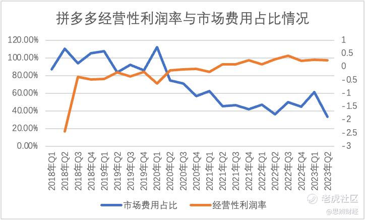 市场费用曾经是拼多多最受争议的期间费用,在上图中我们可以非常直观看到,在企业创立之初,市场费用吃掉了拼多多绝大多数毛利(主要为买量),导致企业连年巨额亏损,2021年之后,市场费用占营收比开始跌破50%,在2023年Q2甚至跌至30%附近,结果也显而易见,市场费用收缩直接改善了盈利条件,经营性利润率开始持续好转。