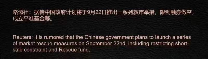 消息面上,市场盛传各类利好消息,如路透社消息:据传中国政府计划将于9月22日推出一系列救市举措,限制融券做空,成立平准基金等: