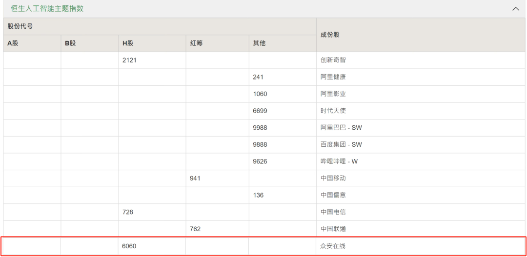 恒生指数有限公司编制的指数一直是主流投资者的重要风向标。恒生人工智能主题指数旨在追踪业务涉及人工智能技术产业链的香港上市公司的表现,经筛选后市值排名最高的40家企业将作为成分股入选。除了众安在线之外,入选指数的还包括在人工智能领域有广泛投入和产出的中国三大移动运营商:中国联通、中国移动、中国电信以及包括阿里巴巴、腾讯、美团、百度在内的互联网领军企业。