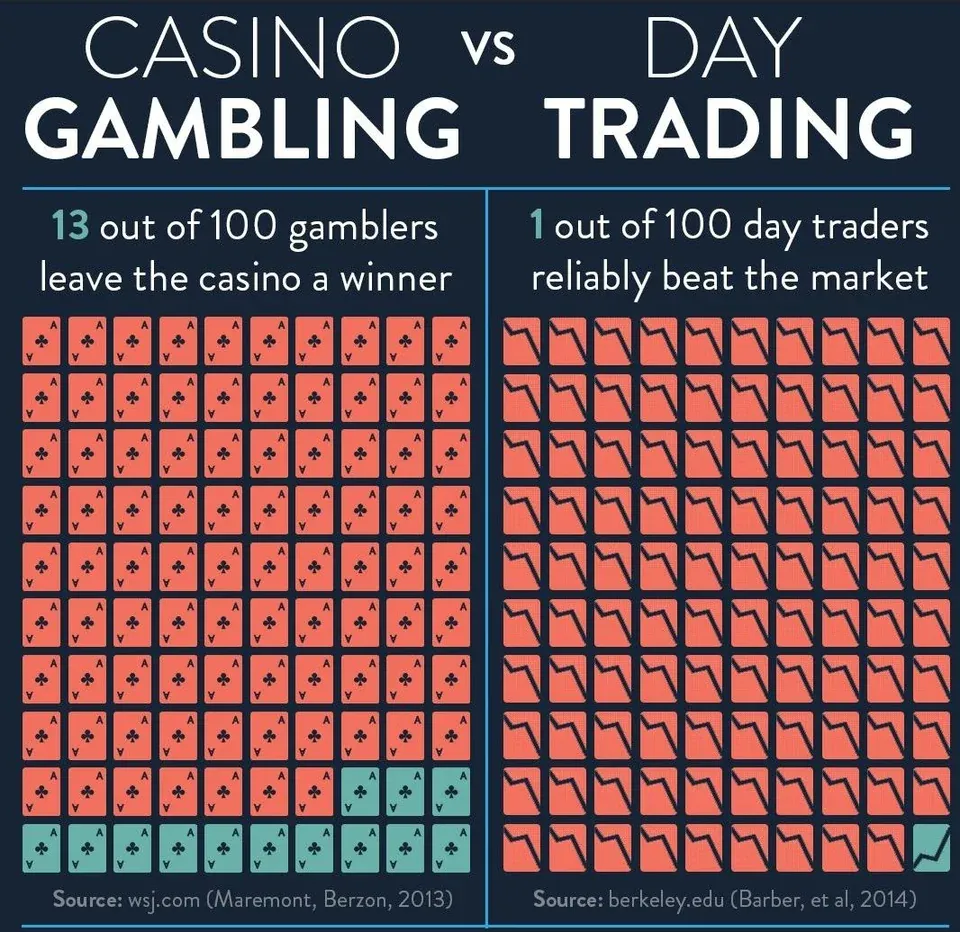 最近小话在冲浪时看到一张图很有趣,左边是赌场的胜率,右边是在股市里日内交易的胜率