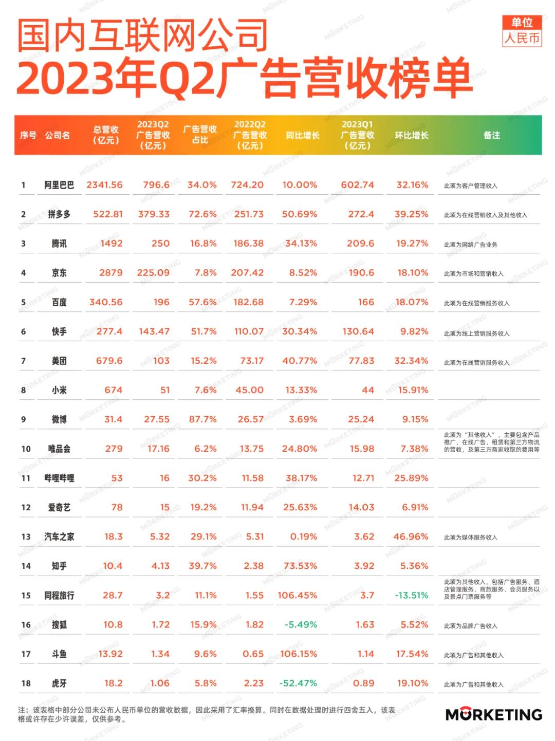中国18大互联网公司广告营收榜(2023年Q2暨上半年):广告市场回暖“板上钉钉”,电商+短视频仍是确定性的关键