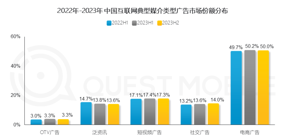 根据QuestMobile发布的《2023互联网广告市场半年报告》,上半年的国内互联网广告市场份额前三名为电商广告、短视频广告、泛资讯广告,分别为50.2%、17.4%和13.8%,与上一年度没有明显差异。