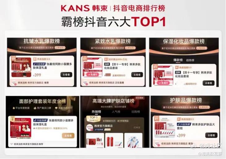 从多家国货上市美妆公司2023年半年报披露的信息来看,抖音渠道业绩亮眼。其中,上美股份品牌韩束成功在抖音赛道实现突围,位列2023上半年抖音护肤品牌销量榜第二,国货护肤品牌销量榜第一,主力爆品“红蛮腰礼盒”在抖音六大榜单实现霸榜。