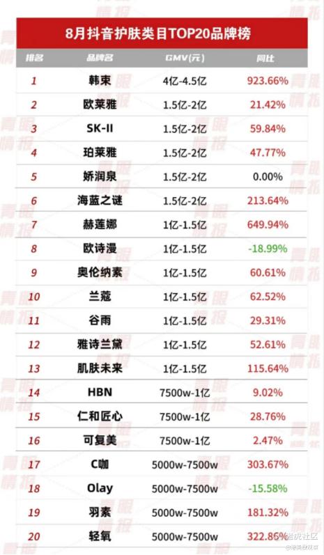 8月,韩束以超4亿元的GMV成为抖音美妆行业位列第一的品牌,同比涨幅高达923.66%,成功实现对欧莱雅的弯道超车,GMV达欧莱雅、SK-II、海蓝之谜等海外大牌GMV的两倍之多。
